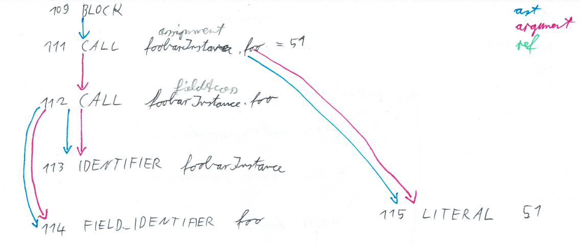 When assigning a value to a struct's field (`foobarInstance.foo = 51;`), the corresponding part of the AST looks like this:  Between the two calls, there is no AST edge.