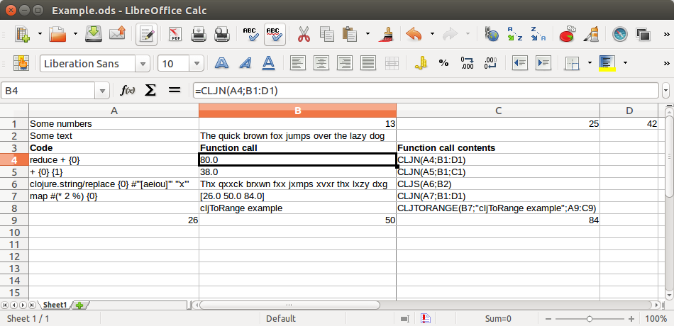 ClojureCalc Combine the power of clojure with all the LibreOffice calc features!!! ClojureCalc is a wrapper for clojure 1.6 on libre office (version 5 or greater) and possibly open office. Download v3.1.0 Check here for more info