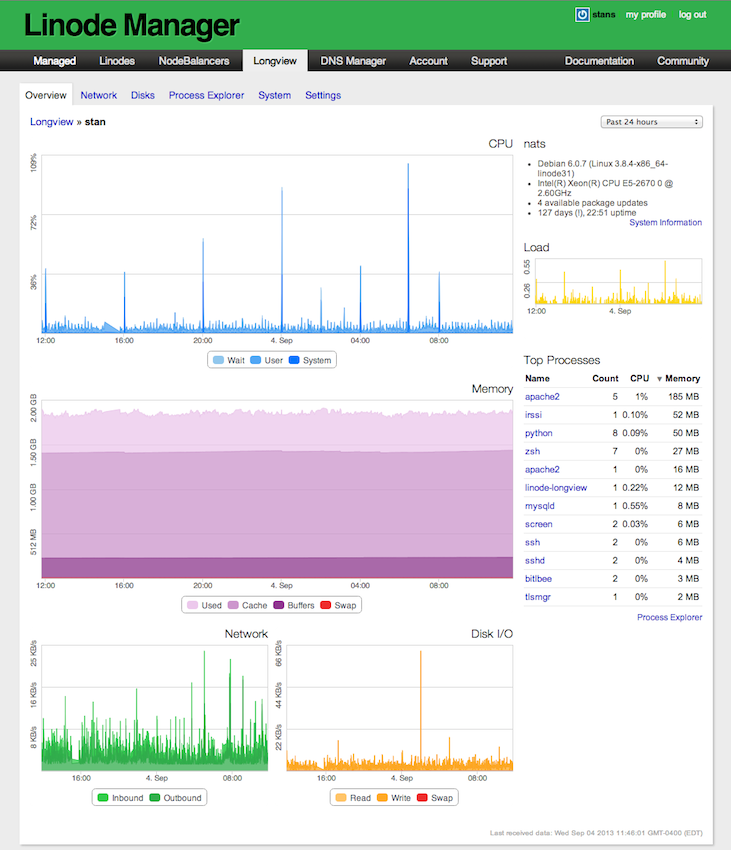 The Linode Manager allows you to interact with data collected and analyze your system's resource usage. You can drill into individual servers: